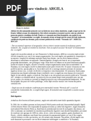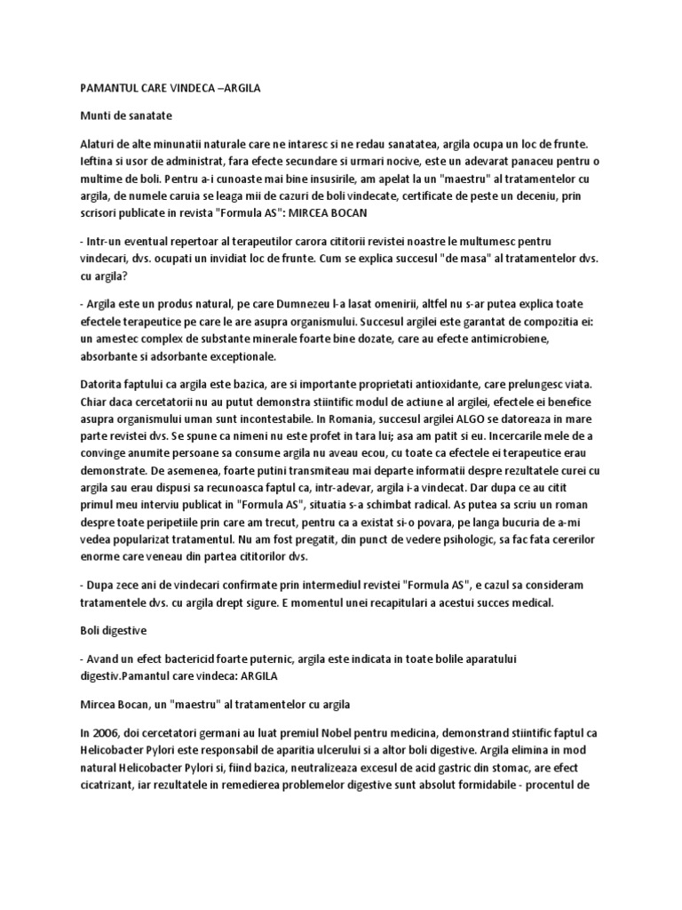Cazuri rezolvate cu argila algo. N funcie de vechimea bolii de vrst de stresul acumulat de condiile de munc i de via ale fiecruia cura de ntreinere poate varia de la 10 zile pe lun la 15 20 de zile sau n cazurile mai grave. Folosesc din 2001 argila algo si pot sa spun ca datorita acestui leac natural nu mai sunt internata in spitale tot timpul. Mi am rezolvat infectia urinara pielonefrita litiaza renala hipertiroidia si multe altele. A fost testata si s a demonstrat ca din compozitia sa chimica fac parte foarte multe minerale naturale esentiale pentru organismul nostru care se absorb foarte usor.