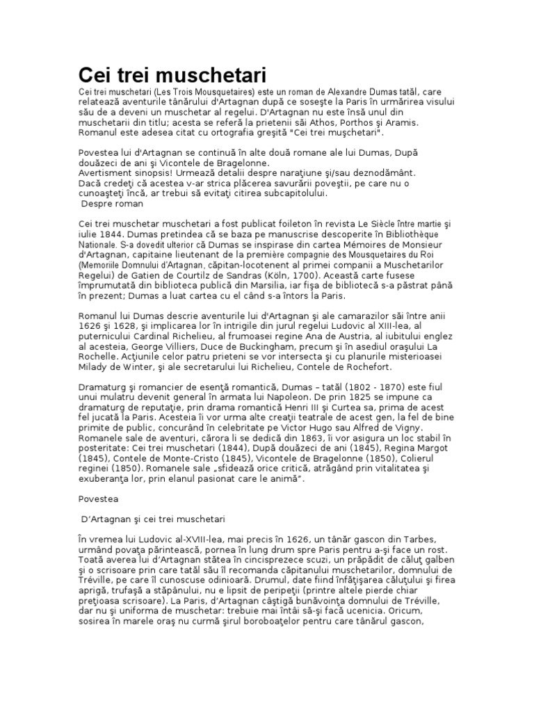 Daca nu imi dati link puteti sa imi scrieti aici. Va prezentam rezumatul pentru unul din cele mai frumoase si citite romane ale lui alexandre dumas cei trei muschetari. Cei trei muşchetari de alexandre dumas rezumat în prima zi de luni din aprilie 1625 un tânăr gascon din tarbes pe nume d artagnan ce semăna cu don quijote la optsprezece ani urma să părăsească casa părintească ascultând poveţele celor doi părinţi pornind într un drum de lung spre paris pentru a şi face un rost.