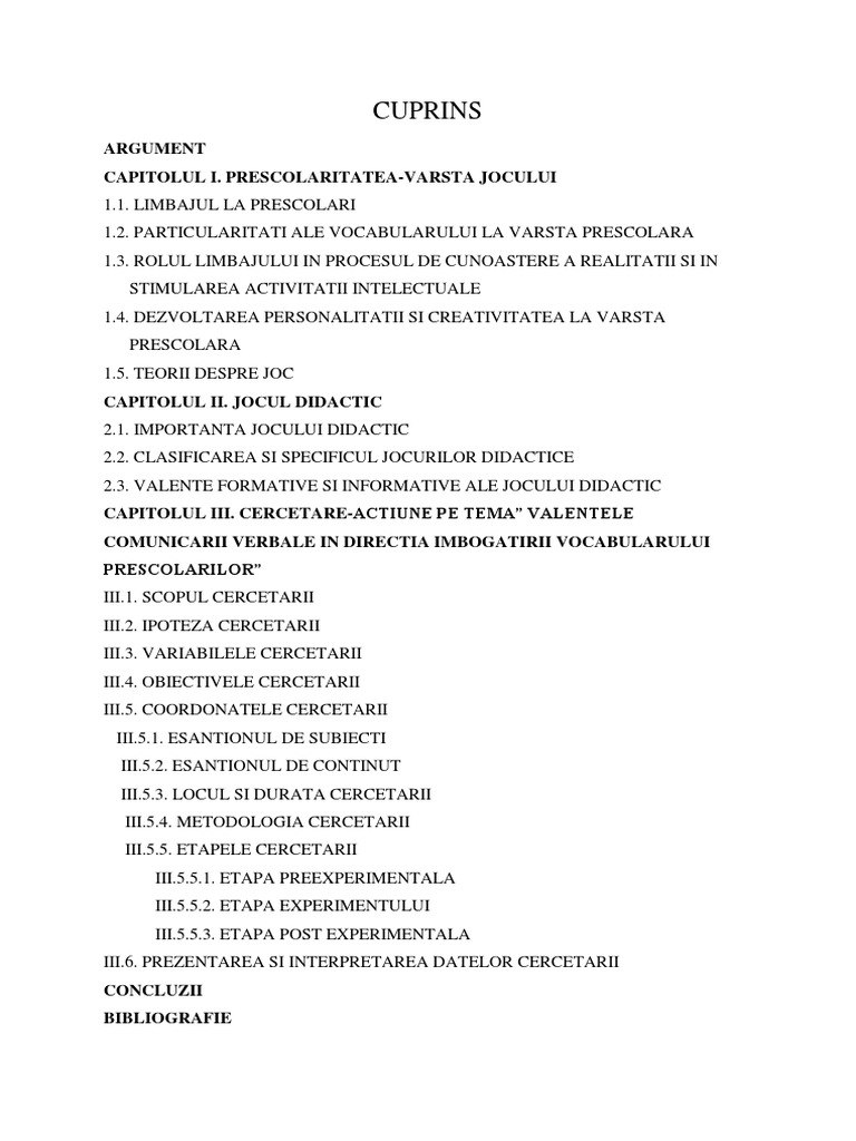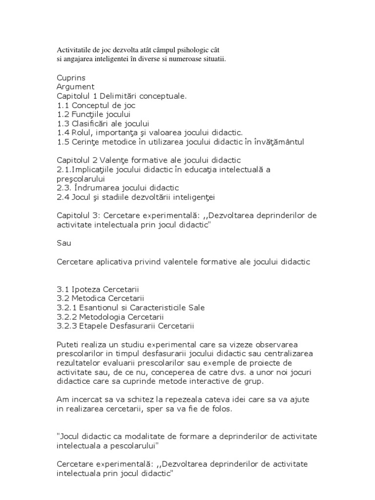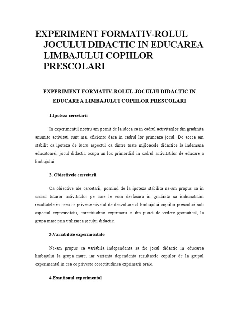 Jocul didactic are drept scop pe de o parte instruirea copiilor într un domeniu al cunoaşterii iar pe de altă parte sporirea interesului pentru activitatea respectivă prin utilizarea unor elemente distractive caracteristice jocului facilitează atingerea scopului formativ educativ urmărit şi împreună cu celelalte activităţi frontale exercită o puternică influenţă asupra copilului în vederea pregătirii sale pentru şcoală. Proiect de cercetare pedagogica 11 februarie 2008 22 56 l am intocmit ca tema pentru facultate dar a constituit si un antrenament pentru lucrarea de grad i. Proiect de cercetare psihopedagogică. Jocul didactic in educarea limbajului la grupa mare motivarea subiectului abordat am pornit in demersul meu de la ideea ca activitatea fundamentala din gradinita este jocul pentru educarea limbajului copiilor vom utiliza tot jocul insa de data aceasta jocul didactic care presupune sarcini didactice concrete si.