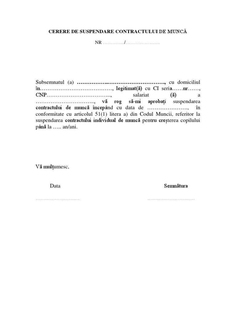 Cerere suspendare contract de munca. Perioada si cauzele de suspendare a contractului individual de munca cu exceptia cazurilor de suspendare in baza certificatelor medicale se inscriu in registrul general de evidenta a salariatilor revisal conform art. Este practic punerea în aplicare a articolului 153 din codul muncii. 2 suspendarea contractului individual de munca are ca efect suspendarea prestarii muncii de catre salariat si a platii drepturilor de natura salariala de catre angajator. Contractul individual de munca poate fi suspendat din initiativa salariatului pentru concediu pentru crestere copil.