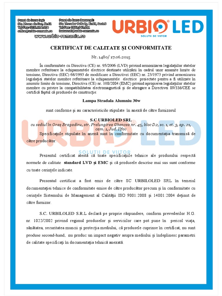Certificat Calitate Si Conformitate Lampa Iluminat Stradal Led