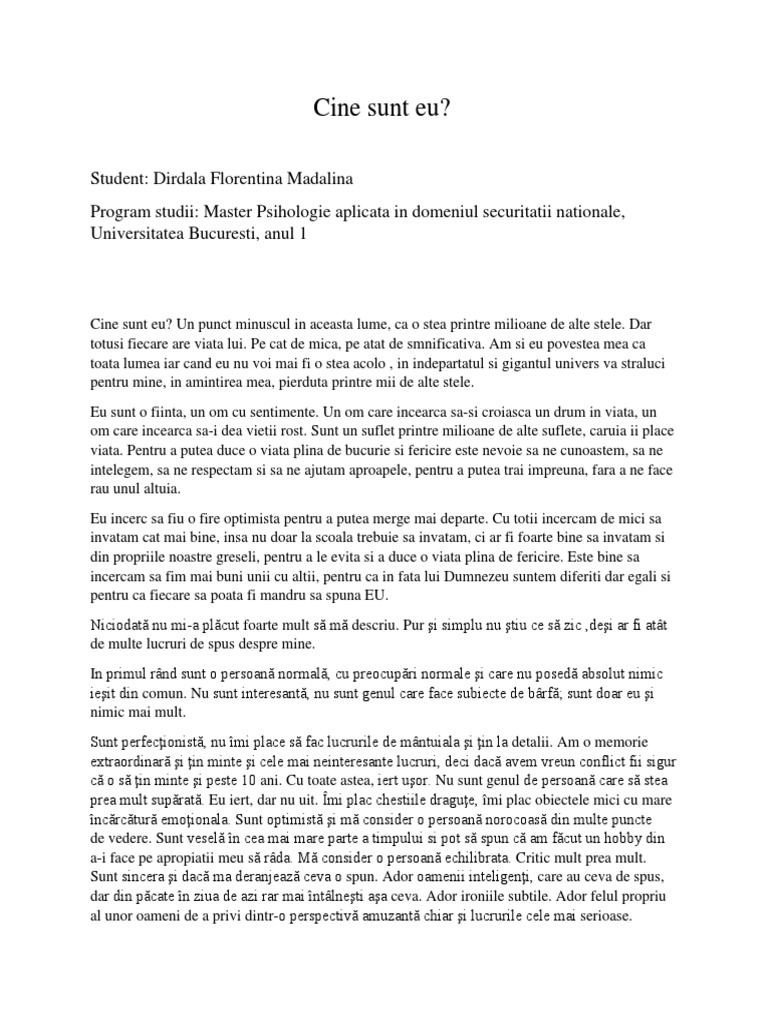 Cine sunt eu dar în activitatea mea de psiholog această întrebare are semnificaţii complexe. Gina dafinoiu student anul 2 ifr facultatea de psihologie universitatea ecologică din bucurești eu sunt in cele din urmă căutarea de sine. Exist pentru că mă caut pe mine însumi. Despre mine vă pot spune că am absolvit facultatea de psihologie din cadrul universităţii lucian blaga din sibiu în anul 2002.