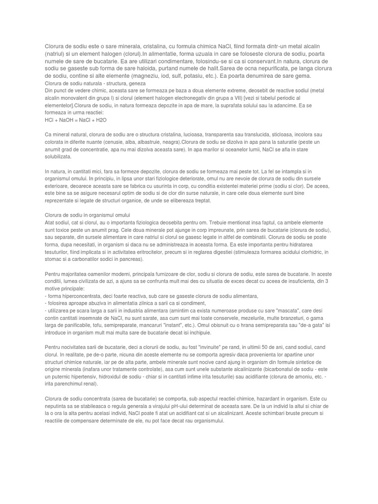 Clorura de sodiu stare naturala. In 1832 2 medici englezi au folosit o perfuzie de clorura de sodiu cu succes impotriva holerei pentru prima data. Ca mineral natural clorura de sodiu are o structura cristalina lucioasa transparenta sau translucida sticloasa incolora sau colorata in diferite nuante cenusie alba albastruie neagra clorura de sodiu se dizolva in apa pana la saturatie peste un anumit grad de concentratie apa nu mai dizolva aceasta sare. Clorura de sodiu este sarea sodiului cu acidul clorhidric și are formula nacl. Sarea mai este denumita si clorura de sodiu naci si este formata 40 din sarea sodiului si 60 din acid clorhidric.