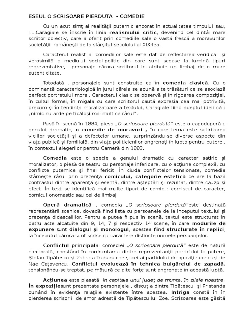 Specie a genului dramatic care are drept scop infatisarea unor personaje moravuri sociale intr un mod care starneste rasul avand intotdeauna un final comic. Comedia o scrisoare pierduta de i. Comic tragic si fantastic. Opera literara o scrisoare pierduta se inspira din evenimentele politice ale anului 1883 este jucata pe scena in 1884 si publicata in 1885.