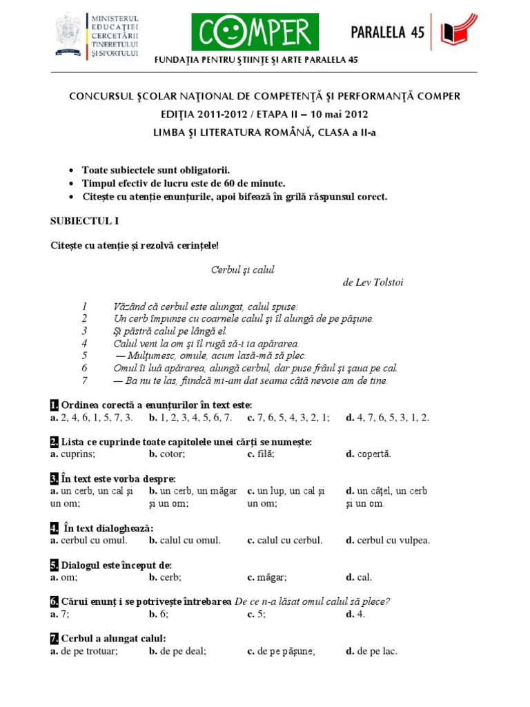 Comper romana clasa 3. Modele de subiecte pentru comper 2020 etapa i matematică. Contractele de parteneriat incheiate in anul scolar 2018 2019 sunt valabile si pentru anul scolar 2019 2020. Fundaţia pentru ştiinţe şi arte paralela 45 1 concursul şcolar naţional de competenţă şi performanţă comper etapa i limba şi literatura română clasa a iii a varianta 1 toate subiectele sunt obligatorii timpul efectiv de lucru este de 60 de minute citeşte cu atenţie textele care urmează apoi notează în grilă răspunsul corect la întrebările date. Comper este cel mai mare concurs scolar fara taxa de participare destinat elevilor din clasa pregatitoare clasele i viii.