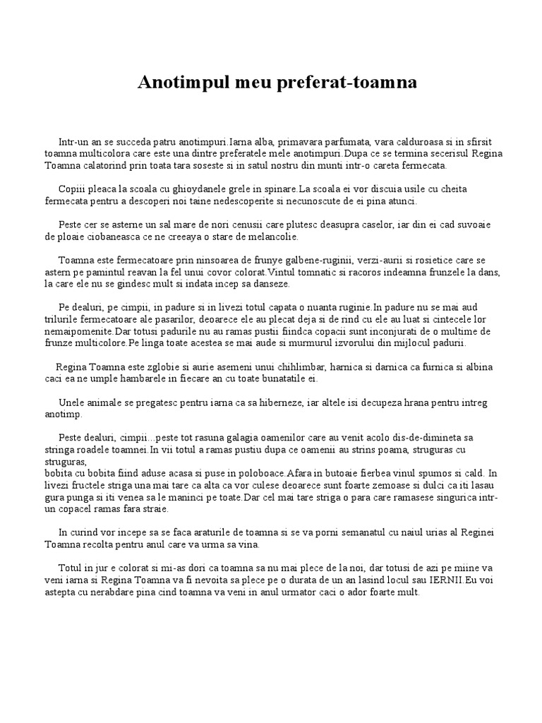 Compunere despre anotimpul vara. Plin cu caldura si miresme care mai de care mai imbietoare cand spui vara te gandesti la mare plaja si nisip impreuna cu familia sau prietenii vara soarele arde cu putere molesind orice vietate care ii apare in cale fie ia planta om sau o insecta cat de mica. Era o zi foarte călduroasă numai bună de o plimbare prin pădurea răcoroasă departe de soarele care. El mângâie natura cu razele sale blânde. Alcatuieste o scurta compunere despre anotimpul preferat al meu este vara 451698.