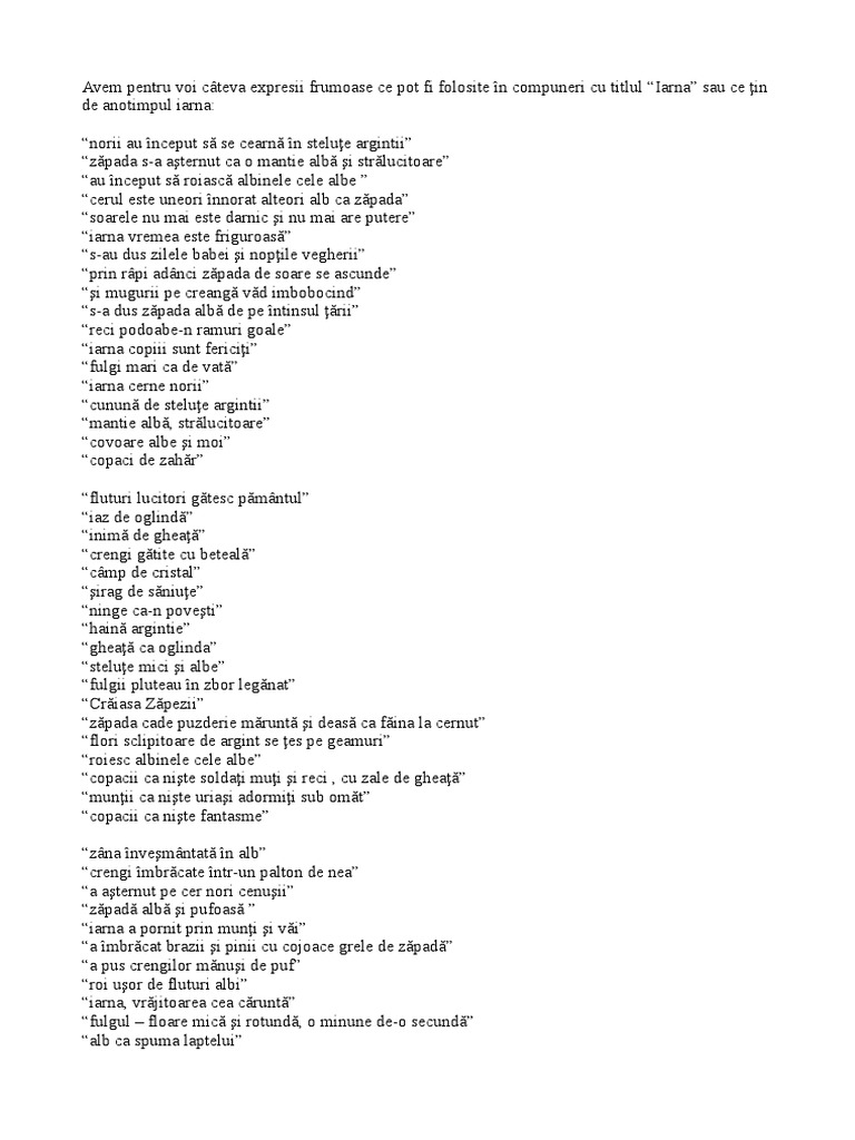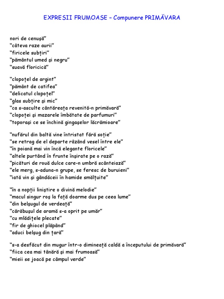 Oricât te ai strădui să scrii o compunere bună dacă nu folosești și expresii frumoase nu vei reuși. Expresii frumoase despre fulgi de zăpada nea omăt 2 14 comentarii. Read compunere despre primavara from the story expresii frumoase și compuneri by acosmosa andra cîșleanu with 7 602 reads. Compuneri despre toamna cu expresii frumoase scurte sectinio septembrie 23 2013 amurg de toamna compuneri despre toamna cu expresii frumoase scurte 99 comments paraiele plang plecarea calda a verii pasarile pleaca iar spre nicaieri frunzele palide ca ceara de lumanare cad si mor flori tarzii s.