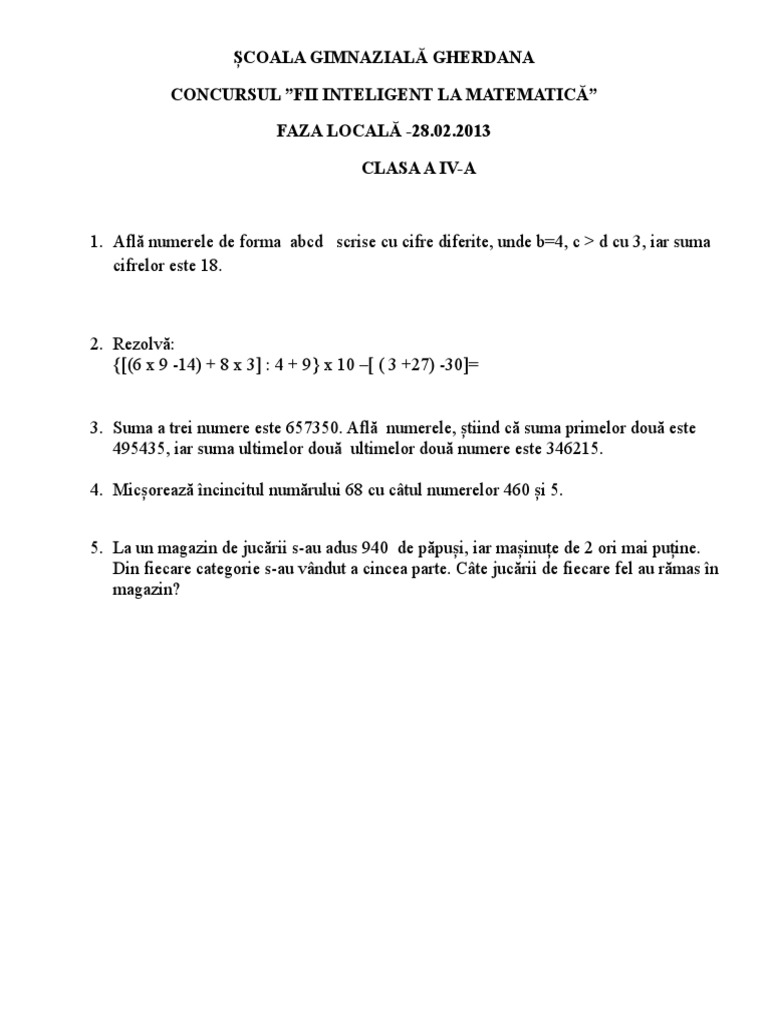 Concursul fii inteligent in matematică subiecte si bareme calarasi cls ii iv propune un material. Rezultate concursul național fii inteligent la matematică clasa a iv a 2017 2018. Acum un an am participat la acest concurs si am luat 85 de puncte iar acum 2 ani am luat 100 puncte. Maine e concursul si sper sa nu fie greu.