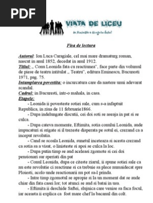 Conul leonida faţă cu reacţiunea farsă într un act i l caragiale persoanele conul leonida pensionar 60 de ani coana efimiţa consoarta lui 56 de ani safta slujnica lor în bucureşti la leonida o odaie modestă de mahala. Piesa de teatru este structurată într un singur act iar acțiunea se desfășoară într o odaie modestă de mahala. Pe masa o lampa cu gaz. Conu leonida fata cu reactiunea de ion luca caragiale.