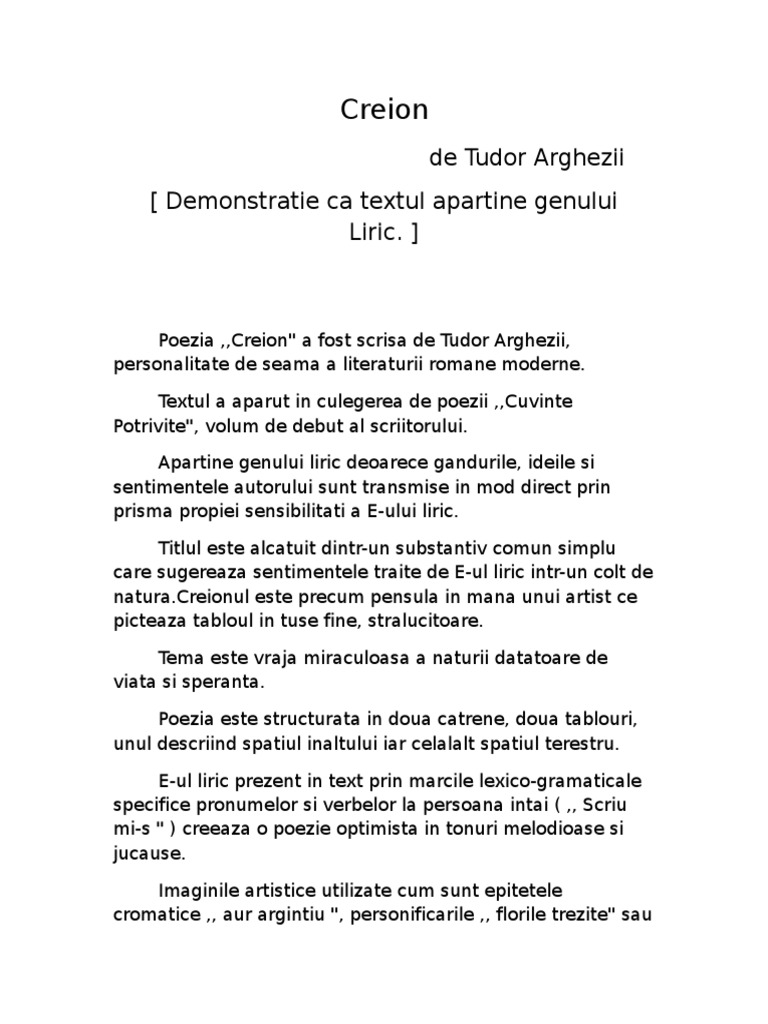 Ai nevoie de câteva argumente pe care să le folosești pentru a demonstra că poezia creion de tudor arghezi este o operă lirică. Titlul gradina se contureaza ca un spaţiu privilegiat pentru poet in care acesta poate scrie uimit de frumuseţea fara seaman a naturii. Poezia creion face parte din volumul stihuri noi în care tudor arghezi descrie cu încantare un tablou din natura respirand liniste si lumina frumusete si echilibru. Obrajii tăi mi s dragi cu ochii lor ca lacul în care se oglindesc.