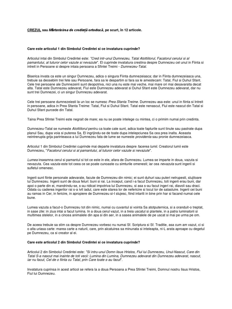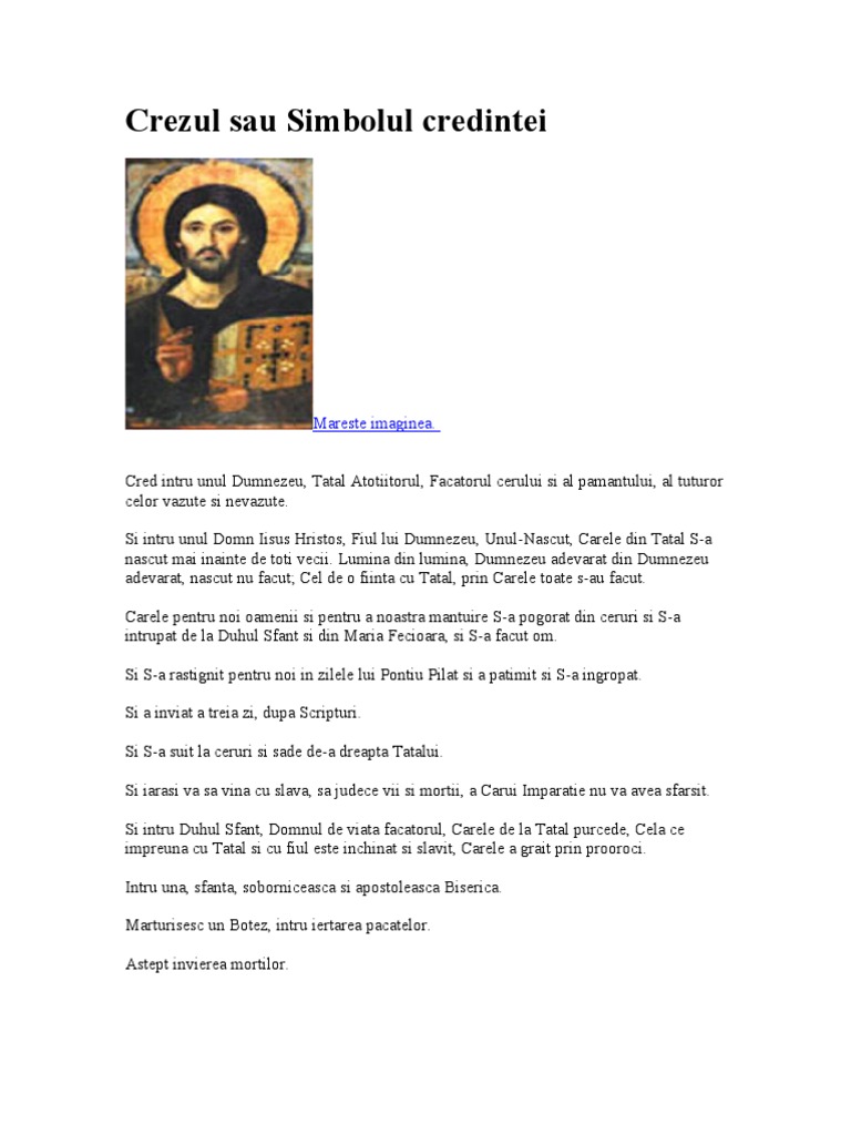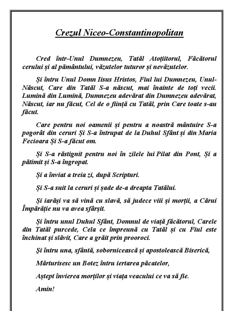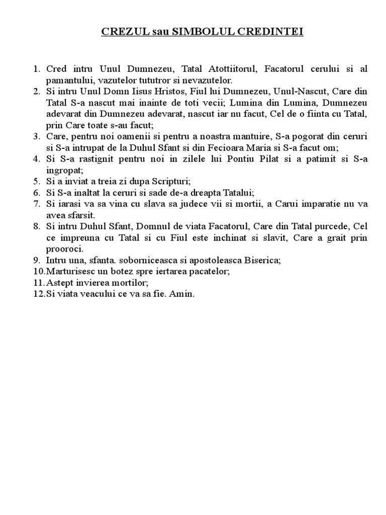 Crezul sau simbolul credintei. Rugăciuni ortodoxe crezul sau simbolul credintei cred intru unul dumnezeu tatal atotiitorul facatorul cerului si al pamantului al tuturor celor vazute si nevazute. Crezul sau simbolul credinţei cred într unul dumnezeu tatăl atotțiitorul făcătorul cerului și al pământului văzutelor tuturor și nevăzutelor. Crezul sau simbolul credintei cred intru unul dumnezeu tatal atotiitorul facatorul cerului si al pamantului al tuturor celor vazute si nevazute. Crezul sau simbolul credintei reprezinta sinteza hotararilor dogmatice de la sinodul i ecumenic de la niceea tinut in anul 325 si a celui de al doilea de la constantinopol din 381.
