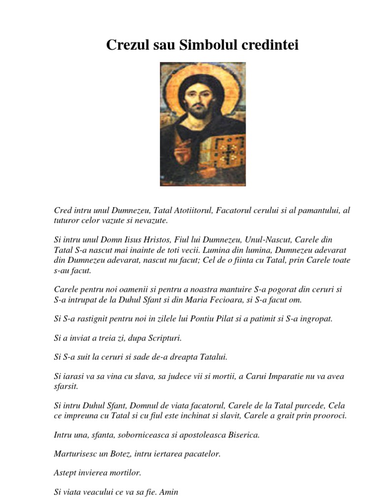 Simbolul de credinta apostolic sau roman simbolul de credinta al bisericii din neo cezareea pontului simbolul de credinta al bisericii din cezareea palestinei simbolul de credinta al bisericii din alexandria si altele. și într unul domn iisus hristos fiul lui dumnezeu unul născut care din tatăl s a născut mai înainte de toți vecii. Cred într unul dumnezeu tatăl atoţiitorul făcătorul cerului şi al pământului al tuturor celor văzute şi nevăzute. Si intru unul domn iisus hristos fiul lui dumnezeu unul nascut carele din tatal s a nascut mai inainte de toti vecii.